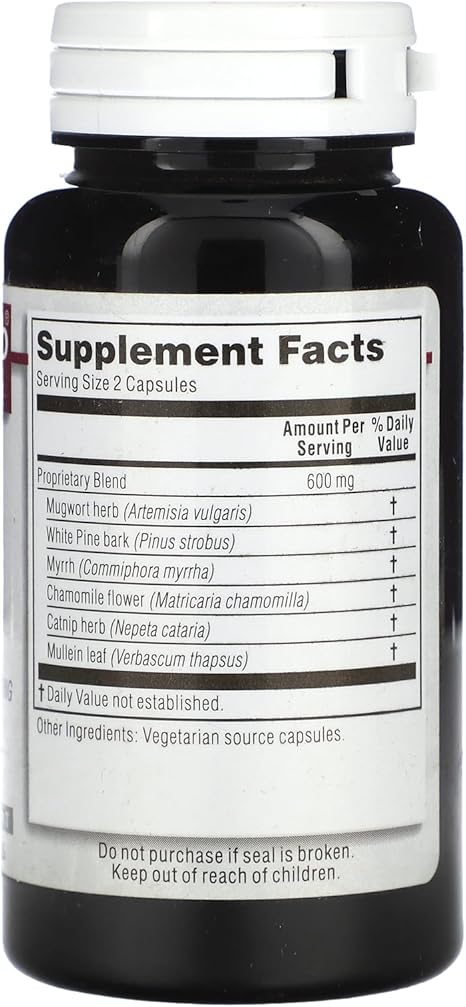 One of our most unique products designed for sustaining proper digestive enzymes. The key to its success is that it is entirely herbal. Proprietary Blend of Mugwort, White Pine Berk, Myrrh, Chamomile Flower, Catnip Herb, Mullein Leaf. 100 Capsules |